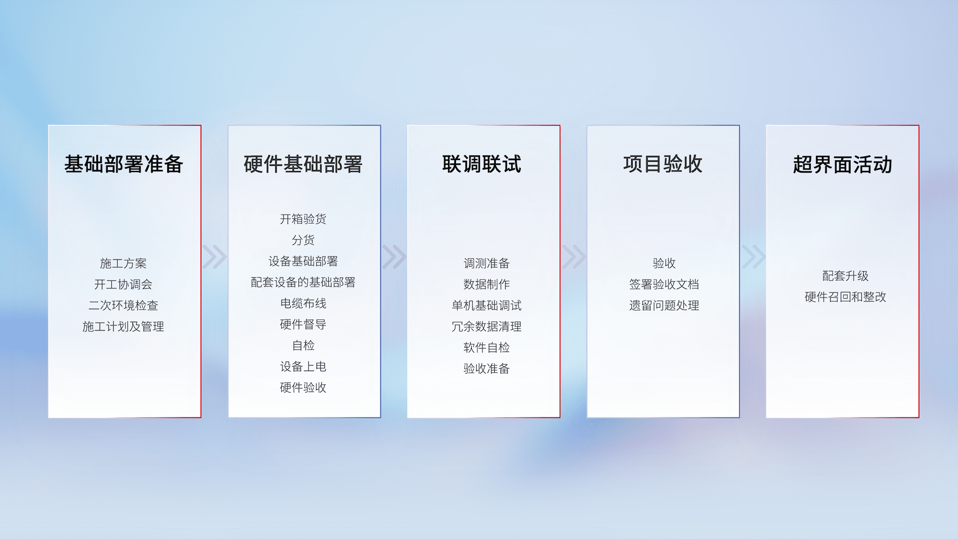 从基础部署准备、、、硬件基础部署、、、、联调联试、、项目验收、、越界面活动的全过程可追溯,,,保证施工质量和进度。。。